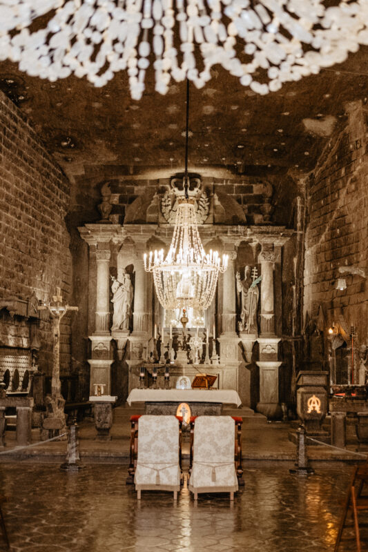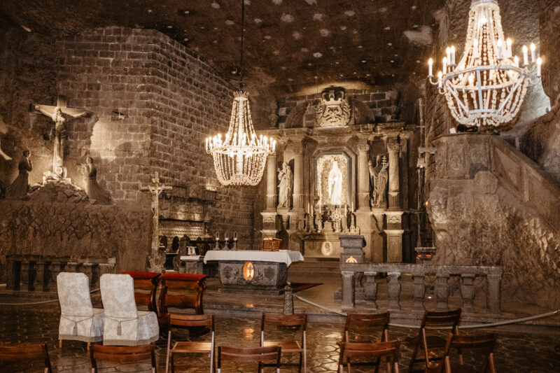 The chapel delights with its space and decoration made entirely of salt. It is the most magnificent and richest temple in the Wieliczka Salt Mine. Its décor was created almost a hundred years ago by talented sculptor miners. The crystal chandeliers, the beautiful salt floor and hundreds of details, each of which is a small work of art, complete the ambiance of this place. Weddings in the chapel take place after the last group of visitors has completed their tour of the mine, which is typically around 8:30 PM.