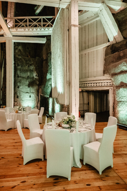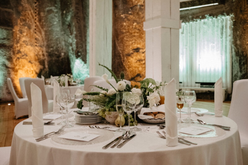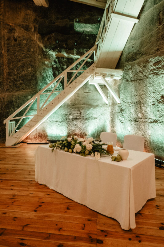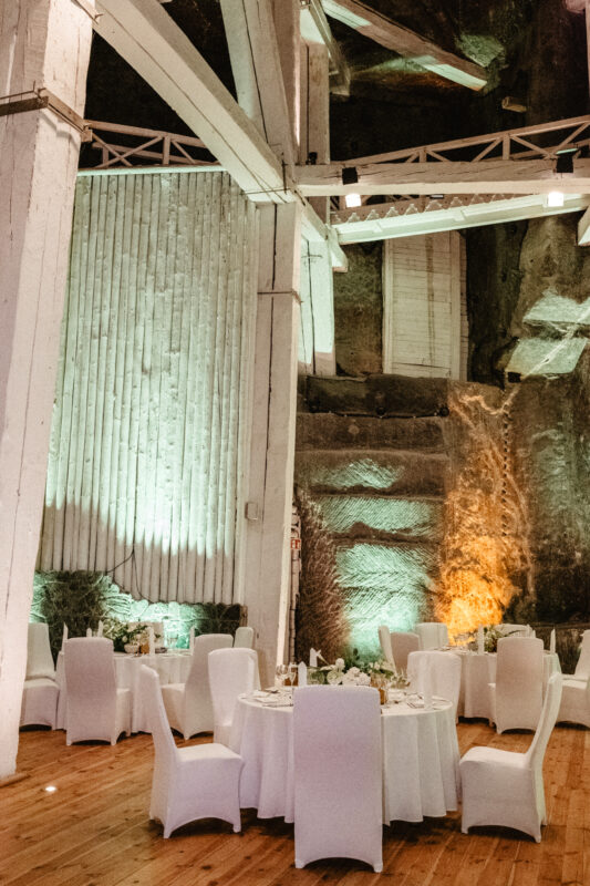The breathtaking Jan Haluszka Chamber is one of the halls that is most commonly used for wedding receptions. You’ll be mesmerized by the salted ceiling that rises over 13 meters in height and the salt walls that are lit by crystal chandeliers. The uneven form of the walls and ceiling is reminiscent of the party’s one-of-a-kind setting, 135 meters underground yet so close to nature.